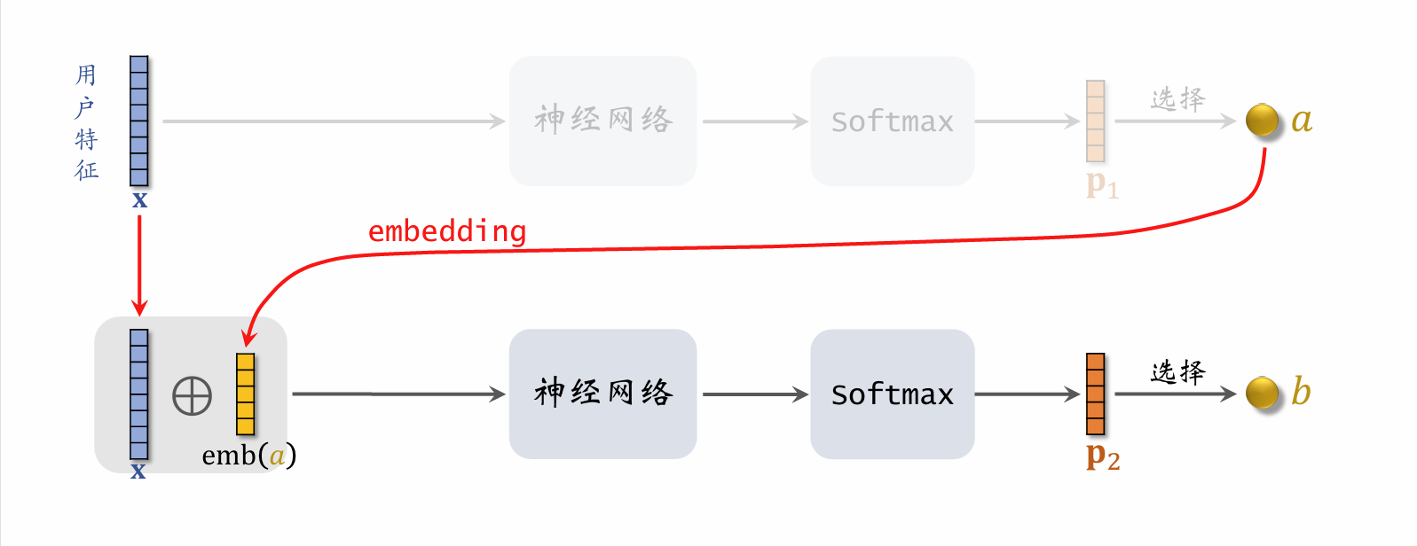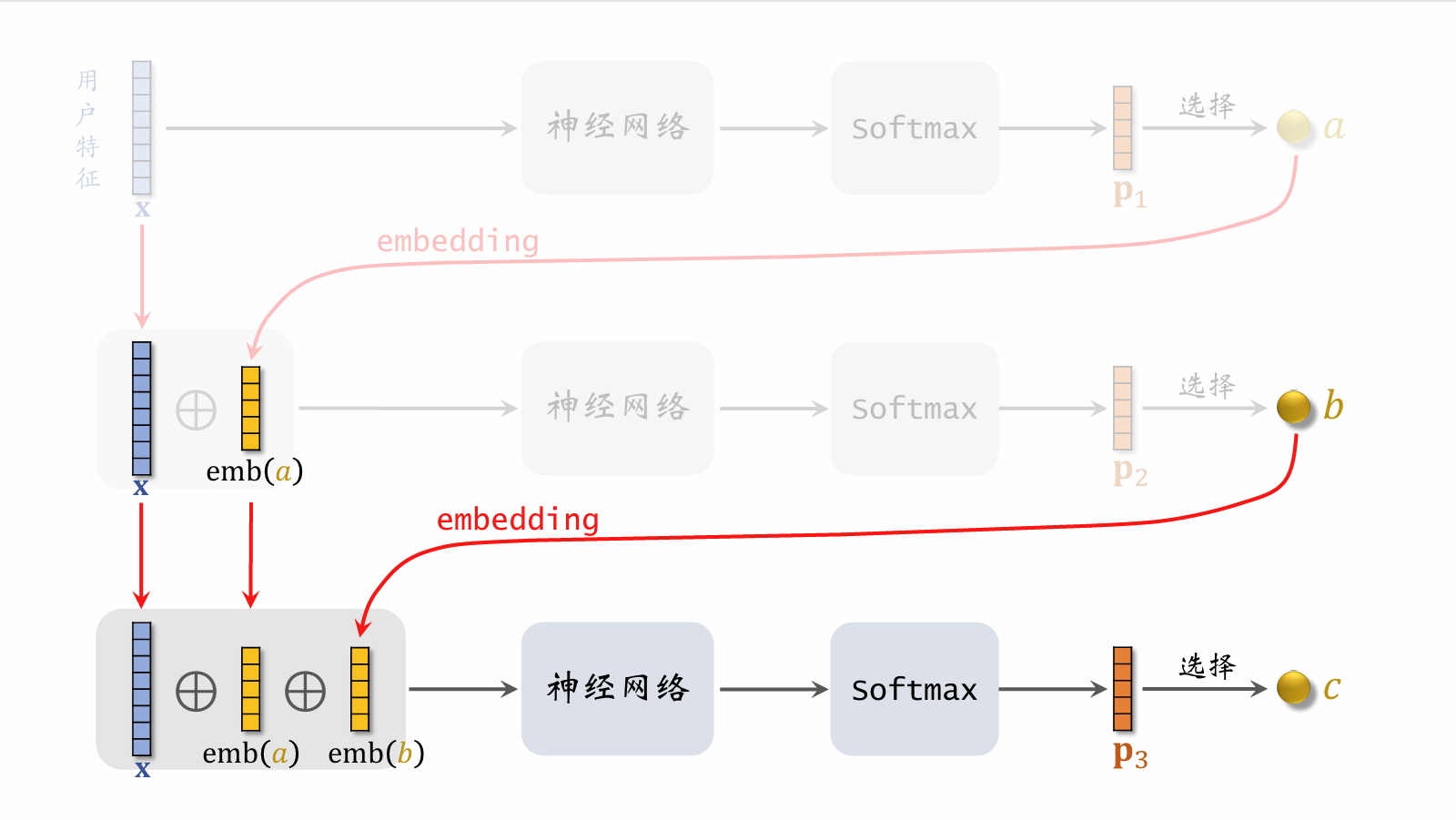• 给定用户特征 x\mathbf{x},用神经网络预估用户对路径 path=[a,b,c]\text{path} = [a, b, c] 的兴趣,分数记作 p(pathx)p(\text{path} \mid \mathbf{x})