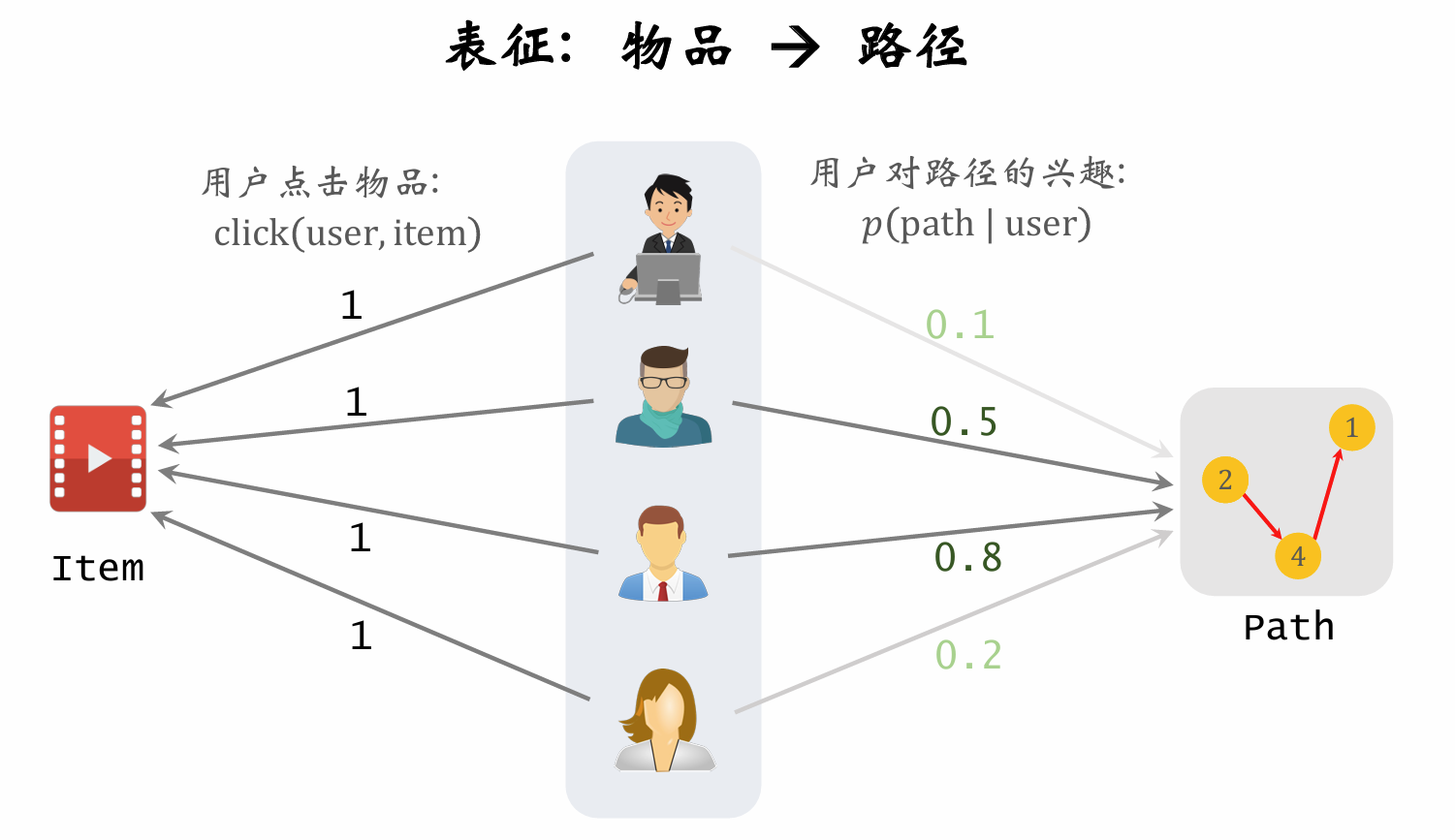 召回: 用户 → 路径 → 物品