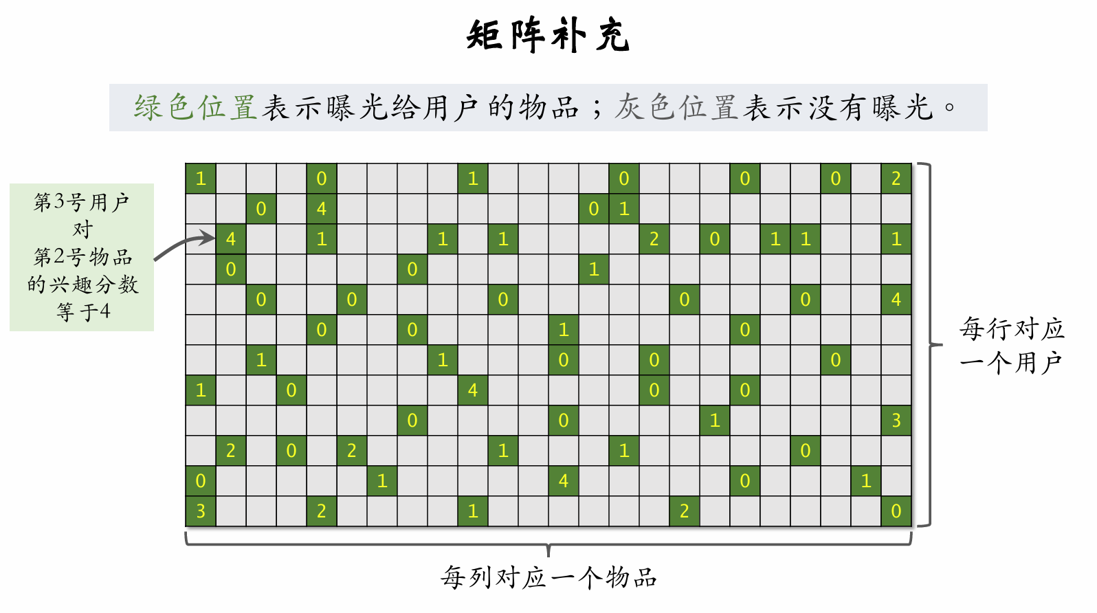 • 预估用户 useruser 对每个物品 itemitem 的兴趣分数:
