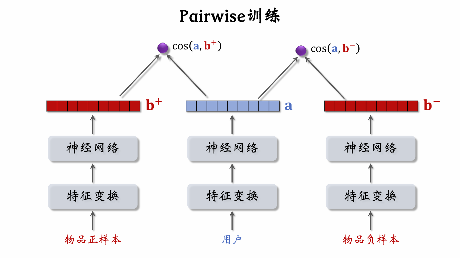 • 如果用户点击过物品,则更新神经网络参数,使分数增大: